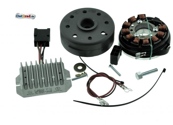 Powerdynamo alternátor 6V 100W pro AWO-Sport a AWO-Touren. Obsahuje: rotor, stator, regulátor a upevnění. Nahrazuje pouze alternátor, nenahrazuje zapalování.