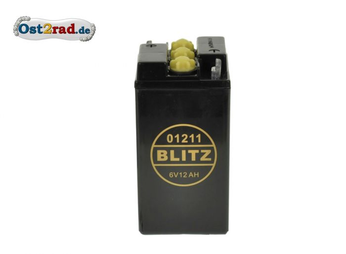 Baterie pro MZ Oldtimer RT 125, BK 350, EMW R35, SIMSON Oldtimer AWO a IWL s 6V palubním napětím. Kapacita 12Ah. Rozměry: výška/šířka/hloubka 165/90/90 mm.