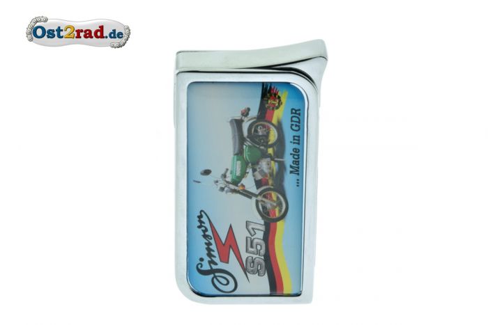 Kovový zapalovač chromového vzhledu s nápisem S51.