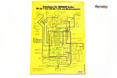 Plakát rozměrů 40cmx60cm. Zobrazuje plán zapojení SIMSON SR50/ 1CE a SR80 /1CE se startérem. Plakát je z materiálu odolného proti zašpinění, vhodný do dílny.