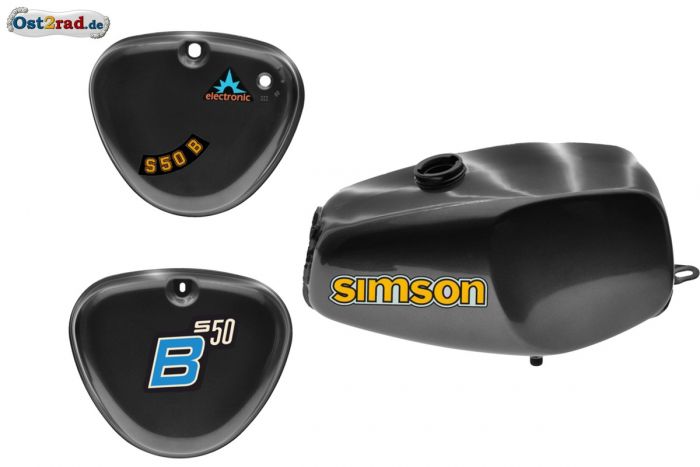Nádrž s kastlíky pro motocykly Simson S50, S51, S70. Nádrž je tzv. buvol , originální pro S50. Originální pro S51 je tzv. banán nádrž. Vnitřní tunel nádrže je o 3 mm širší než originál a pasuje na novější gumy. Díly mají vady v lakování, škrábance nebo důlky. Funkčnost není omezena. Sada obsahuje nádrž , levý a pravá kastlík a gumy pod nádrž. Barva černá metalíza.