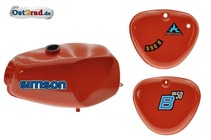Nádrž s kastlíky pro motocykly Simson S50, S51, S70. Nádrž je tzv. buvol , originální pro S50. Originální pro S51 je tzv. banán nádrž. Vnitřní tunel nádrže je o 3 mm širší než originál a pasuje na novější gumy. Díly mají vady v lakování, škrábance nebo důlky. Funkčnost není omezena. Sada obsahuje nádrž , levý a pravá kastlík a gumy pod nádrž. Barva červená.