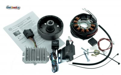 Kompletní plně elektronické zapalování s alternátorem, výkon 12V , 100 wattů. Pro MZ ES125, ES150, ETS125, ETS150, TS125 a TS150. Zapalování zcela nahradí starý alternátor s přerušovačem nebo předchozí elektronické zapalováním. Na skříni motoru není tř