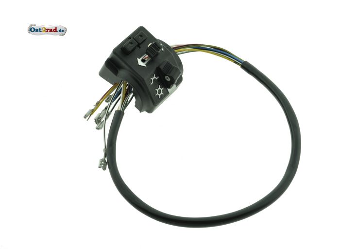 Kombinovaný přepínač, levý přepínač Alu s kabelem pro moto ETZ125, ETZ150, ETZ 250, ETZ 251 a ETZ300. Včetně tlačítek tlumové světlo, blinkr, klakson, světelný klakson. Bez přední půlky těla přepínače. Porovnejte symboly světla a tlumeného světlo s variantou 2.