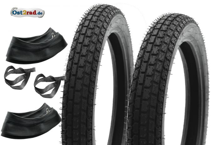 Klasický silniční desén s bloky s moderní konstrukcí. Rozměr: 2,75-18 a 3,25-16. Pro přední a zadní kolo motocyků MZ ETZ 125, ETZ 150 a ETZ 251. Přesné označení: 2,75-18 Reinf. TT 48P 6PR Klassik33 - pro ráfek 1,60-18 a 3,25-16 55P TT 6PR Klassik33 pro ráfek 1,85-16. Sada obsahume 2 x pneumatika, 2 x duše 2 x páska na ráfek. Obě pneumatiky mají stejný vzorek.