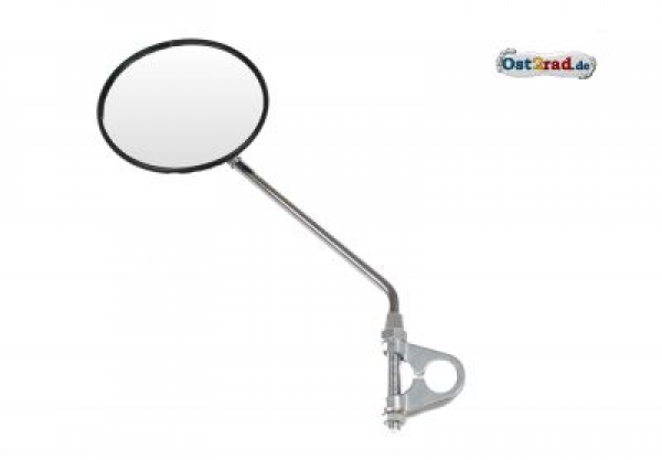 Zpětné zrcátko pro motocykly MZ TS - TS125, TS150 a TS250 s objímkou. Použitelná na všechny řídítka o průměru trubky 20-24 mm. Kvalitní výrobek, nerezová úprava. Ocelová tyčka je pochromovaná. Druhovýroba podle originálních nákresů. Průměr 122mm, délky tyčko po zahnutí 180mm, délka závitu 80mm.