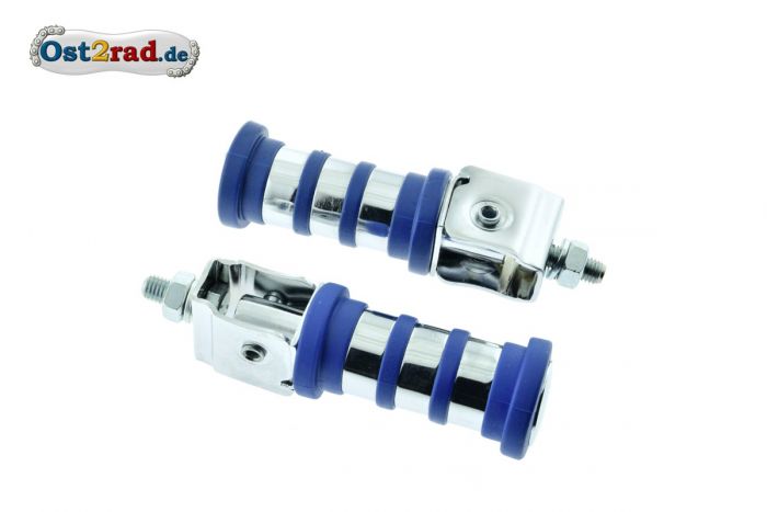 Stupačky spolujezdce, 2 ks, se 4-mi modrámi kroužky pro MZ ES 175/0, ES 250/0, ES 175/1, ES 250/1, ES 175/2, ES 250/2, TS 250/0, TS 250/1, ETS 250, ETZ 125, ETZ 150, ETZ 250, ETZ 251 a  ETZ 301. Stupačky jsou pochromované. Dodávka obsahuje také návlek stupačky, pérovou podložku a matku.