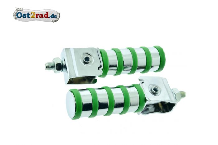 Stupačky spolujezdce, 2 ks, s 5-ti žlutými kroužky pro moto MZ ES 175/0, ES 250/0, ES 175/1, ES 250/1, ES 175/2, ES 250/2, TS 250/0, TS 250/1, ETS 250, ETZ 125, ETZ 150, ETZ 250, ETZ 251 a  ETZ 301. Stupačky jsou pochromované. Dodávka obsahuje také návlek stupačky, pérovou podložku a matku.