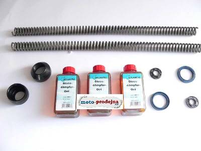 Sada k opravě teleskopické vidlice. Pro motocykly MZ , TS 125 , TS 150 , TS 250 , ETZ 125 , ETZ 150 , ETZ 250 , ETZ 251 . Obsah: 2x pružina, ,2x krytka, 2x ventil, 2x těsnění se dvěma břity, 0,5 l vidlicového oleje.