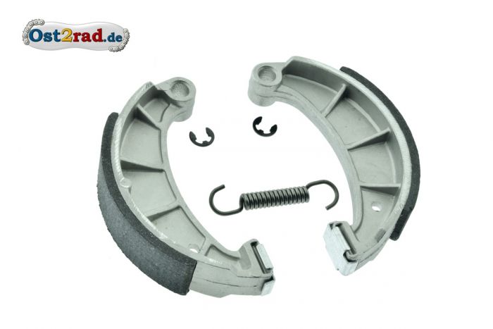 Kompletní sada brzdových čelistí pro 1 kolo. Obsahuje 2 čelisti, 2 pojisté kroužky a pružinu. Čelisti maji ocelovou vložku u brzdového klíče pro měnší oděr. Dále mají speciální povrch pro lepší brzdný účinek. Pro moto Simson KR50, Spatz, Star, Habicht, Sperber, KR51 Schwalbe KR51/1 a KR51/2, SR50, S50, S51, S53, S70.
