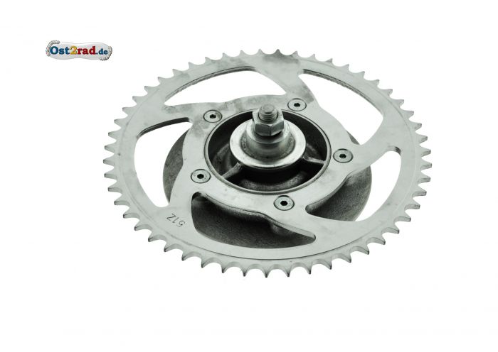 Zadní řetězové kolo, rozeta 51 zubů včetně tlumícího tělesa, kuličkového ložiska, prodloužení osy, pružného kroužku a malých dílů. Vhodná pro Simson SR50M a S53M alpha B.