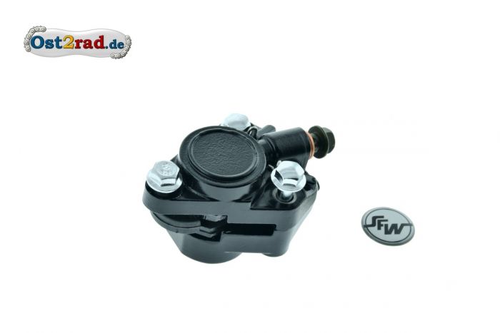Třmen brzdy kompletní pro moto Simson S53 a S83 CX OR, SR50 a SR80 XC XCE s kotoučovou brzdou. Lze použít i na S51 a S70 pro přestavbu na kotoučovou brzdu. Třmen je kompletně osazený včetně dutých šroubů, měděné podložky vedení a pojistnách klipů. Pro