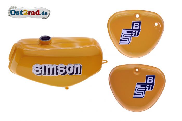 Nádrž s kastlkem na nářadí a kastlíkem baterie pro motocykly Simson S51 a další. Dobrá kvalita. Nádrž typu banán pro S51. Barva sahara hnědá je podobná původní DDR barvě tmavě žluté.
