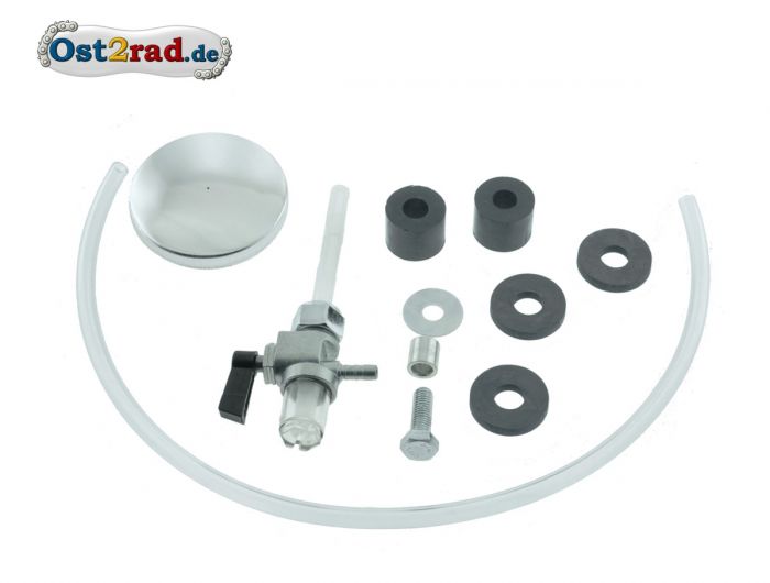 11-ti dílná sada přislušenství nádrže Simson Mokick S50, S51 a S70. Obsahuje: víčko, benzinová hadička, kohout, 5 gum uložení, šrouby, podložky a distatnnční kusy upevnění. Pro všechny nádrže Simson,.