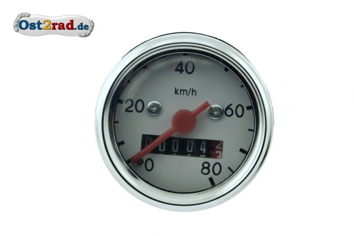 Tacho o průměru 48mm a bílým ciferníkem, 1. provedení s lehce vypouklým sklem. Pro moto SIMSON S50 a první S51. S kontaktem uzemnění a osvětlením žárovkou 12V 1,2W která je součásní dodávky. S těsnícím kroužkem.
