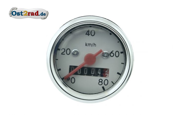 Tacho o průměru 48mm a bílým ciferníkem, 1. provedení s lehce vypouklým sklem. Pro moto SIMSON S50 a první S51. S kontaktem uzemnění a osvětlením žárovkou 6V 1,2W která je součásní dodávky. S těsnícím kroužkem.