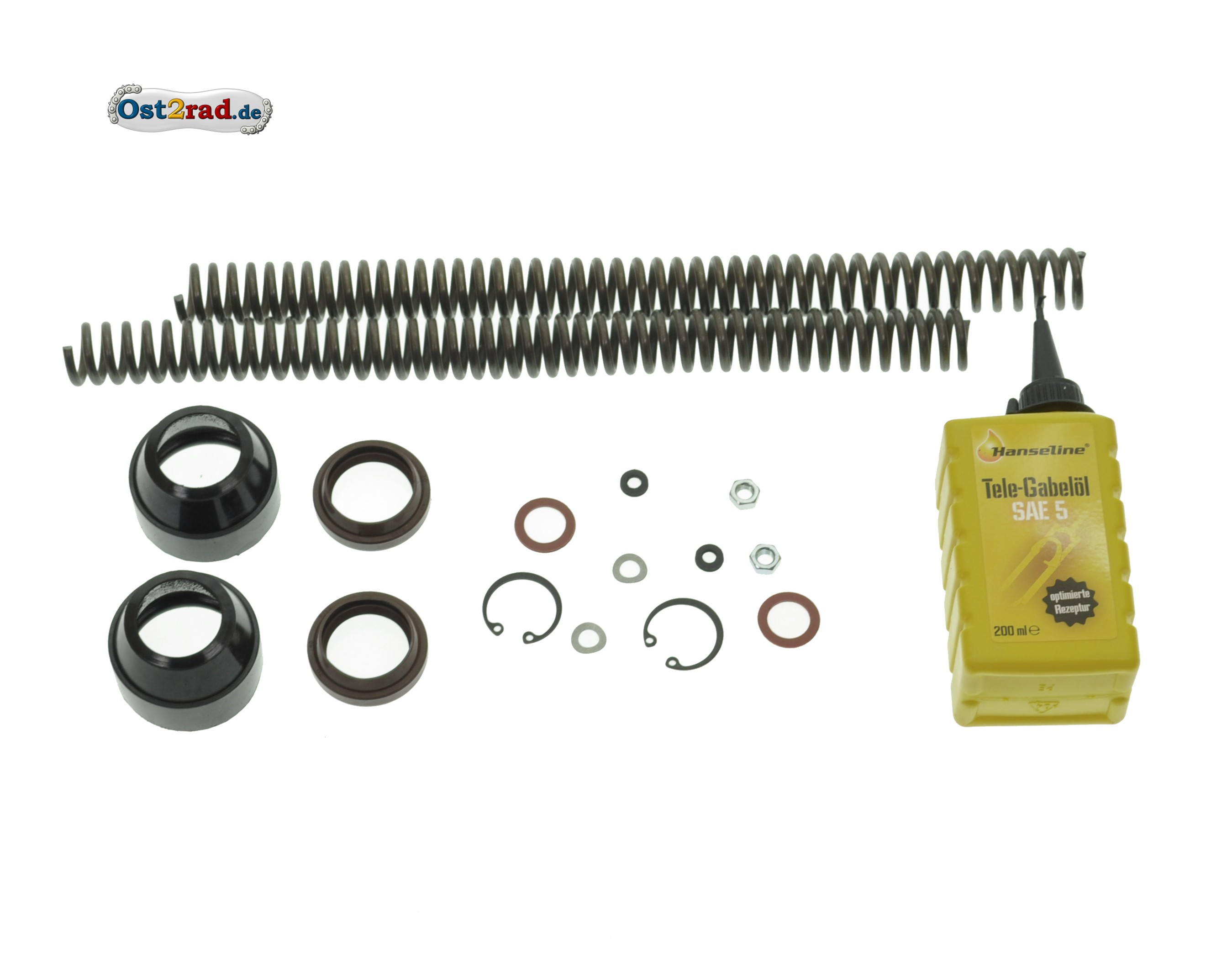 17 - dílná sada k opravě teleskopické vidlice motocyklů Simson S50 , S51 , S60 , S83 , S63. Sada obsahuje všechny důležité díly vidlice (silnější pružiny 3,4 mm, pružné podložky, těsnění, krytky). Dále vidlicový olej určený pro motocykly Simson v množství pro obě vidlice. Dodávka včetně návodu. Manžety teleskopické vidlice také naleznete v našem obchodě.