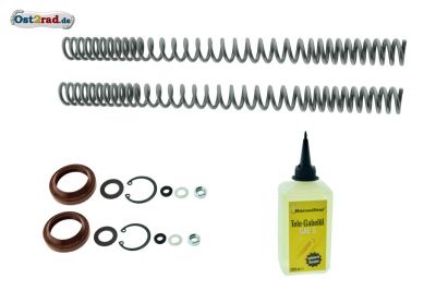 15-ti dílná opravná sada, přední teleskopy s progresivními pružinami pro moto Simson S50, S51, S53, Enduro a SR50. Obsahuje: 2 x pojistný kroužek, 4 x těsnění, 2 x podložka, matky, tlumičový olej a progresivní pružiny. Gufera jsou z FPM s myšším stíracím břitem, hnědá barva. Díly jsou pro obě nohy vidlice.