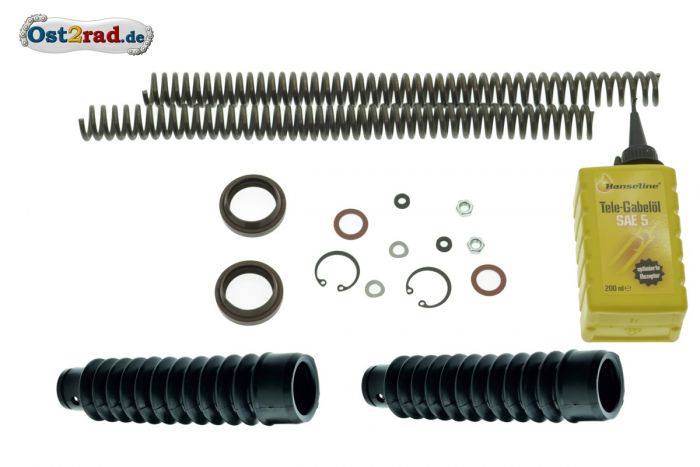 17-ti dílná sada pro opravu přední teleskopické vidlice pro motocykly Simson S50 S51 S53. Sada obsahuje všechny podstatné díly. Pružiny jsou lehce zesílené, pružinové podložky, těsnění, gufera, 2 x manžeta vidlice. Množství olej je také více než dostatečné pro obě nohy vidlice.