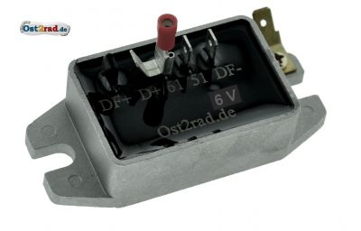 Regulátor dobíjení 6V pro osobní vozy a motocykly. Speciálně pro MZ, IFA, MZ, RT125/1/2. Použitelný i univerzálně pro vozidla s uzemněním na rámu. Ragulátor je ALU odlitek, elektronika je zalitá v tvrdém plastu. Velmi masivní provedení. Tento elektronický reguáátor nahrazuje mechanický regulátor s relé. šírka 60mm, hloubka 40mm, výška 22mm.