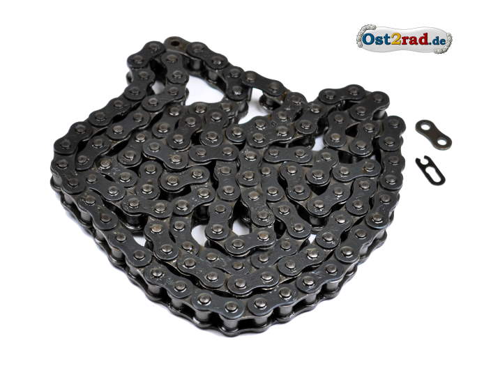 Řetěz 120 článků. Je nutné jej zkrátit podle potřeby na 115 - 118 článků. Pro všechny MZ RT125, typy 125/1, 125/2 a 125/3. Jedná se o válečkový řetěz. Úzké starší provedení. Přesné označení je řetěz 1x12,7x6,4x120 také 1/2 X 1/4.