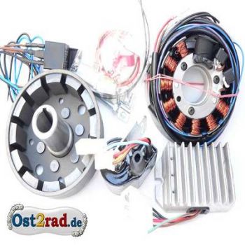 Nové, kompletní plně elektronické zapalování, výkon 12V 100Watt . Zapalování zcela nahrazuje starý alternátor s přerušovačem nebo předchozí elektronické zapalování. Na skříni motoru není třeba provádět žádné změny. Bezkontaktní systém samostatně vytváří