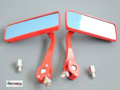 Pravé a levé tuningové zpětné zrcátko pro motocykly Simson S51, SR50 se standardním závitem uchycení M8. Zrcátka jsou kompletně kovová, úchyt ofrézovaný CNC strojem. Sklo je širokoúhlé a tónované proti oslnění. Rozměr skla cca 5 x 13 cm. Barva červená.